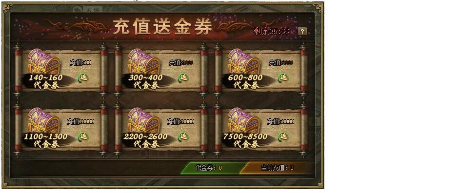 阳春献礼送金券,天降神剑百炼钢 活动一:充值送金券! 活动范围:6月29日(含)之前已开所有服 活动时间:7月19日0点至7月20日24点 活动内容:活动期间,满足下列充值额度就能获得代金券奖励。代金券可在其他代金券 ...