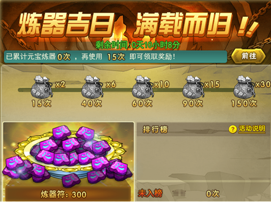 活动范围:7月18日(含)之前已开所有服活动时间:7月28日5:00至7月30日5:00活动内容:活动期间,使用元宝炼器达到指定次数时,可获得炼器福袋奖励。 ※ 活动玩法1. 使用元宝炼器达到指定次数时,可获得炼器福袋奖励 ...