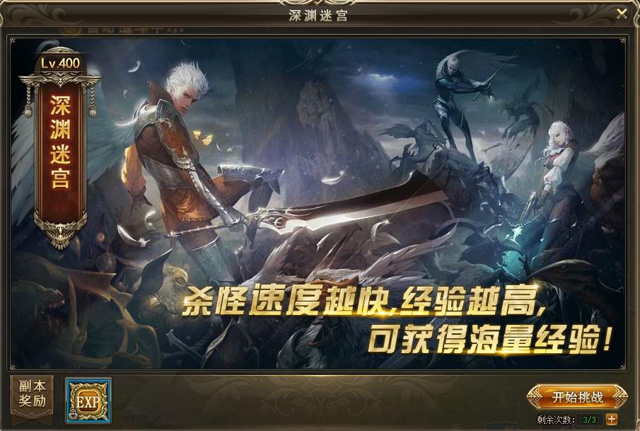 《血盟荣耀》深渊迷宫【活动时间】 全天开放 【参与条件】 84级开启 【玩法介绍】 深渊迷宫副本为单人副本,使用药品提升打怪效率,通过击杀怪物获取海量经验。 【挑战次数】 玩家每日有3次挑战次数,提升VIP等级可 ...