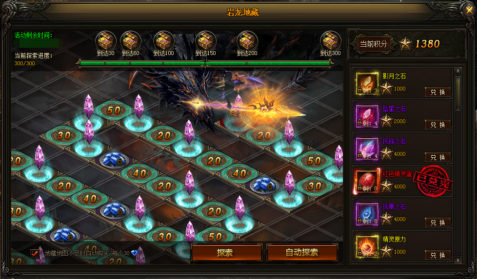 岩龙地藏 活动时间:2018.8.1100:00:00-23:59:59活动范围:大师200级以上的所有玩家 活动内容:1、活动期间,玩家可以通过每次花费30钻石进行探索获得积分,探索的过程中有几率获得珍贵的道具奖励或者大额积分,探索 ...