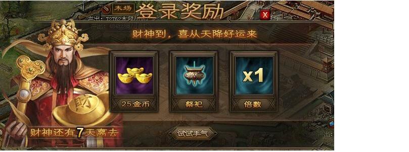 喜从天降财神到、镇守襄阳获陨铁 活动一:财神到,喜从天降好运来! 活动范围:7月27日(含)之前已开所有服 活动时间:8月16日0点至8月17日24点 活动内容:活动期间,满足下列充值额度就能获得额外奖励及buff。充 ...