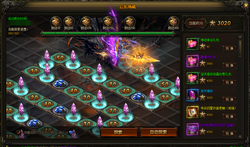 岩龙地藏 活动时间:2018.8.2600:00:00-23:59:59活动范围:大师200级以上的所有玩家 活动内容:1、活动期间,玩家可以通过每次花费30钻石进行探索获得积分,探索的过程中有几率获得珍贵的道具奖励或者大额积分,探索 ...