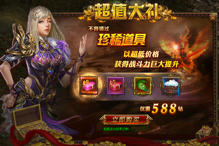 超值大礼 活动时间:2018.8.31 00:00:00-23:59:59 活动范围:大师1级以上的玩家 活动内容:活动期间以超低价格出售珍稀道具,使用可获得战斗力巨大提升!千万不要错过啦!参加活动可获得:1、超值大礼如意宝箱(打开 ...