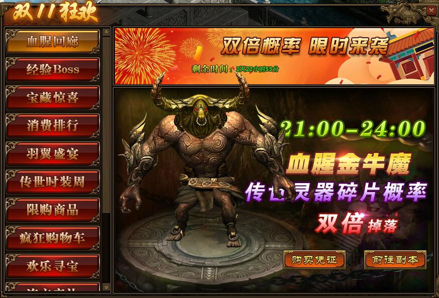 《传奇世界》网页版 双11狂欢 精彩活动 活动一、血腥回廊 活动时间:11月7日-11月9日活动范围:全服 活动内容:1. 活动期间,玩家参与“多人副本-血腥回廊”,获得“传世灵器碎片”的概率翻倍; ...