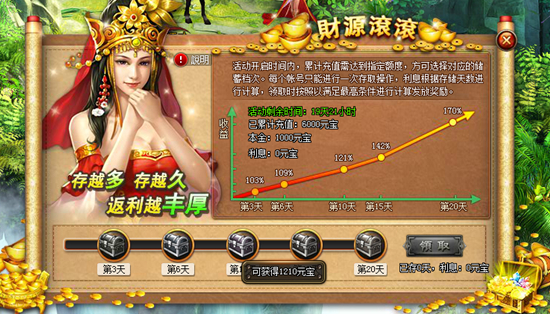 财源滚滚活动介绍 活动开启:角色达到30级以上玩家且处于活动开启时间内,开启财源滚滚活动。 活动时间:3月29日0点-4月18日23点59分。 活动规则: 每次活动开启每名玩家只能进行一次存钱与取钱操作。有五个档 ...