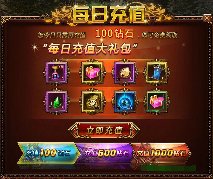 每日充值活动时间:2019.2.19 00:00:00-2019.2.21 23:59:59活动范围:大师200级以上的玩家活动内容:活动期间,每日累计充值分别达到100钻、500钻、1000钻,均可领取丰厚奖励; 充值100钻石可获得:8倍经验药水(普 ...