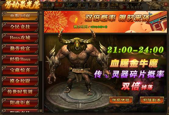 《传奇世界》劳动最光荣 精彩活动 活动一、血腥回廊 活动时间:4月28日-5月4日活动范围:全服 活动内容:1.活动期间,玩家参与“多人副本-血腥回廊”,获得“传世灵器碎片”的概率翻倍;2.活动持续7天 ...