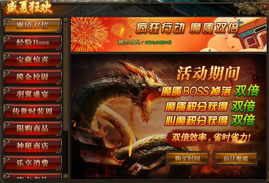 《传奇世界》网页版 盛夏狂欢 精彩活动 活动一、魔魇双倍 活动时间:7月14日-7月16日活动范围:全服 活动内容:1.活动期间,玩家进入魔魇地图击杀魔魇BOSS可获得双倍掉落,获得魔魇、心魔积分翻倍;2.注意:BOSS双倍 ...