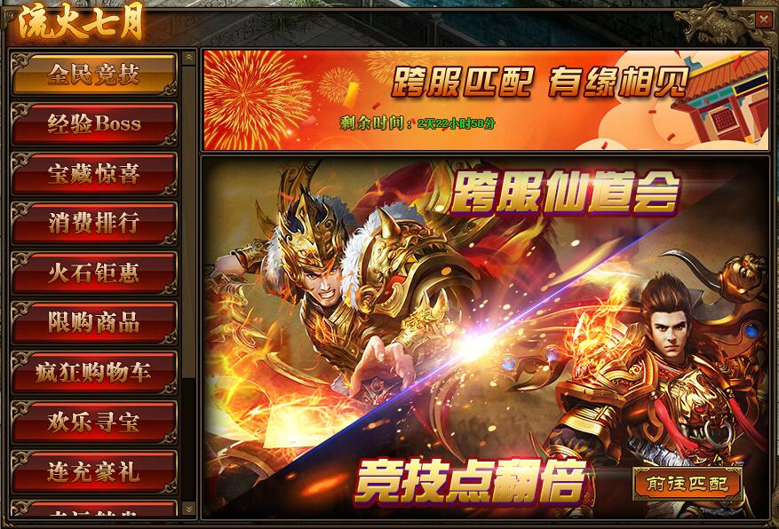 《传奇世界》网页版 流火七月 精彩活动 活动一、全民竞技 活动时间:7月19日-7月21日活动范围:全服 活动内容:1.活动期间,玩家参与跨服仙道会3V3或5V5匹配,获得“竞技点”翻倍; ...