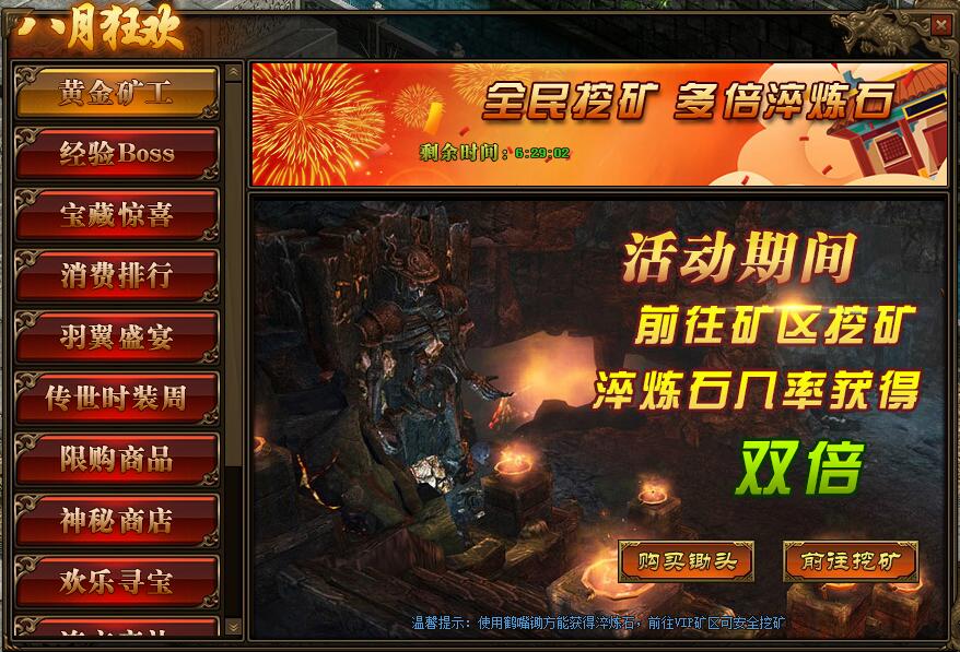 《传奇世界》网页版 八月狂欢 精彩活动 活动一、黄金矿工 活动时间:7月31日(仅此一天)活动范围:全服 活动内容:1.活动期间,玩家使用“鹤嘴锄”进行挖矿,获得“淬炼石”的概率翻倍;2.注意:必须使用“鹤嘴锄” ...