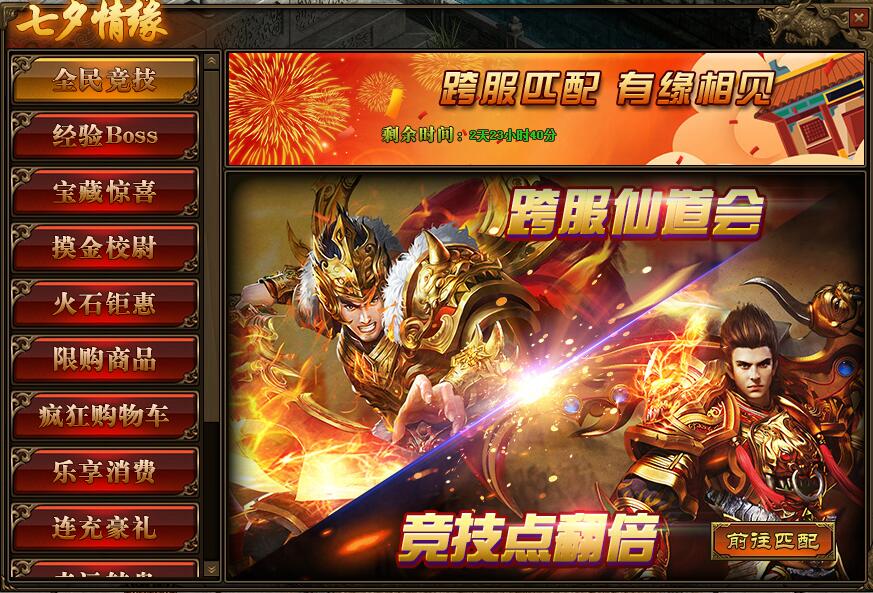 《传奇世界》 七夕情缘 精彩活动 活动一、全民竞技 活动时间:8月5日-8月7日活动范围:全服 活动内容:1.活动期间,玩家参与跨服仙道会3V3或5V5匹配,获得“竞技点”翻倍; ...