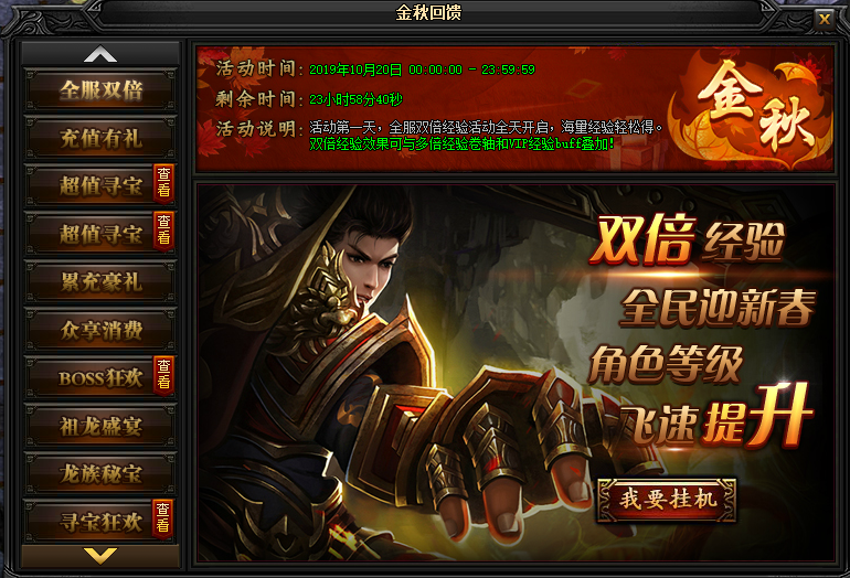 蓝月传奇·金秋回馈活动时间:10月20日00:00:00-10月22日23:59:59 活动一:全服双倍活动时间:10月20日00:00:00 - 23:59:59活动说明:活动第一天,全服双倍经验活动全天开启,海量经验轻松得。双倍经验效果可与多倍 ...