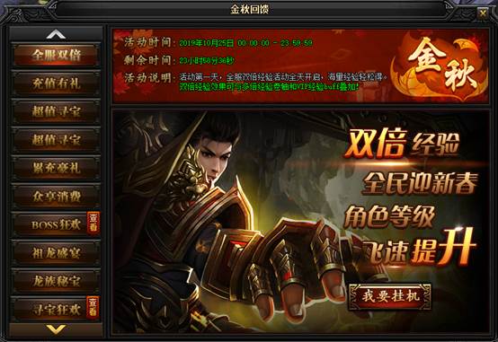 蓝月传奇·金秋回馈活动时间:10月25日00:00:00-10月27日23:59:59 活动一:全服双倍活动时间:10月25日00:00:00 - 23:59:59活动说明:活动第一天,全服双倍经验活动全天开启,海量经验轻松得。双倍经验效果可与多倍 ...