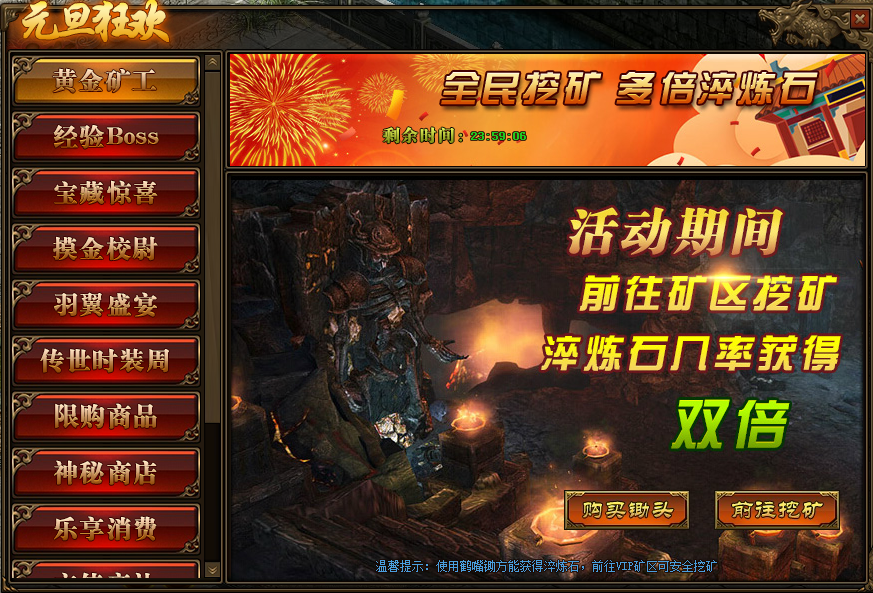 《传奇世界》网页版 元旦狂欢 精彩活动 活动一、黄金矿工 活动时间:12月29日(仅此一天)活动范围:全服 活动内容:1.活动期间,玩家使用“鹤嘴锄”进行挖矿,获得“淬炼石”的概率翻倍;2.注意:必须使用“鹤嘴锄 ...