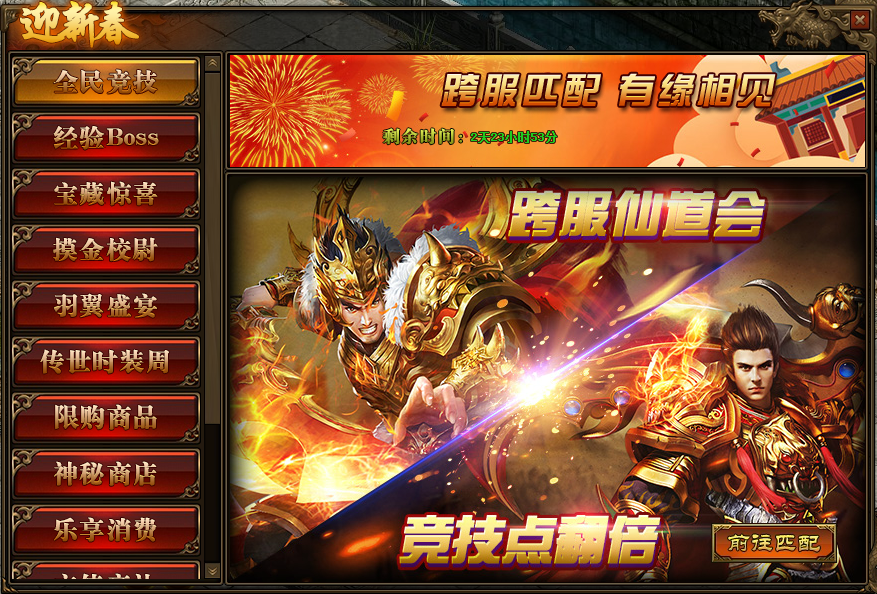 《传奇世界》1月6日迎新春 精彩活动 活动一、全民竞技 活动时间:1月6日-1月8日活动范围:全服 活动内容:1.活动期间,玩家参与跨服仙道会3V3或5V5匹配,获得“竞技点”翻倍; ...