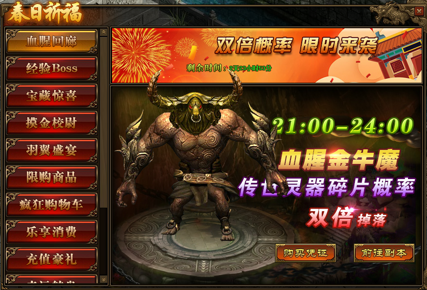 《传奇世界》网页版 春日祈福 精彩活动 活动一、血腥回廊 活动时间:3月24日-3月26日活动范围:全服 活动内容:1.活动期间,玩家参与“多人副本-血腥回廊”,获得“传世灵器碎片”的概率翻倍; ...