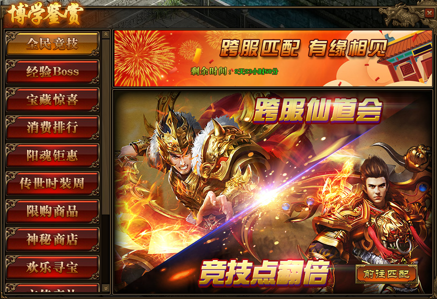 《传奇世界》网页版 博学鉴赏 精彩活动 活动一、全民竞技 活动时间:3月28日-3月30日活动范围:全服 活动内容:1.活动期间,玩家参与跨服仙道会3V3或5V5匹配,获得“竞技点”翻倍; ...