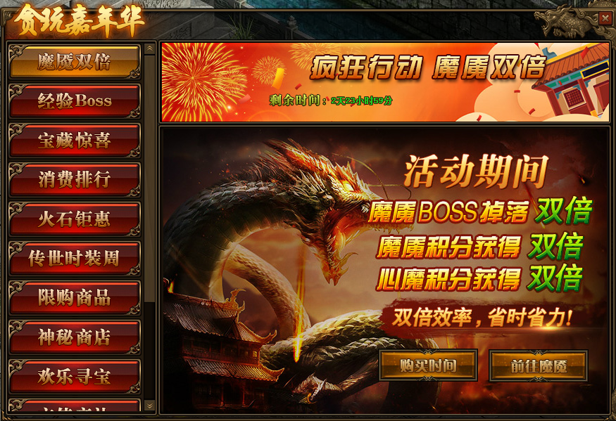 本帖最后由 方块的世界D 于 2020-5-21 11:57 编辑 活动一、魔魇双倍 活动时间:5月18日-5月20日活动范围:全服 活动内容:1.活动期间,玩家进入魔魇地图击杀魔魇BOSS可获得双倍掉落,获得魔魇、心魔积分翻倍;2 ...