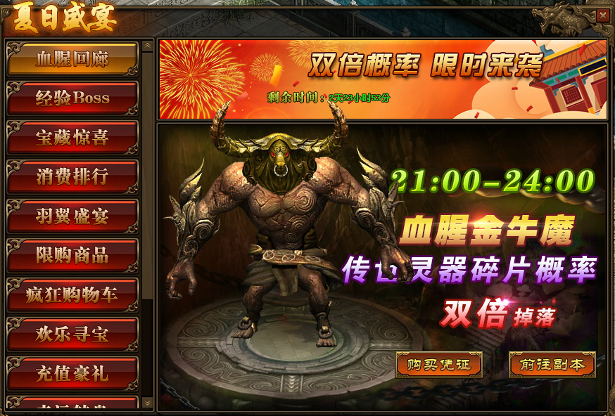 《传奇世界》网页版 夏日盛宴 精彩活动 活动一、血腥回廊 活动时间:5月27日-5月29日活动范围:全服 活动内容:1.活动期间,玩家参与“多人副本-血腥回廊”,获得“传世灵器碎片”的概率翻倍; ...