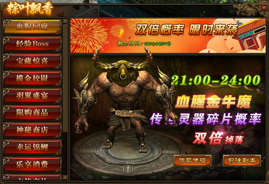 《传奇世界》网页版 粽叶飘香 精彩活动 活动一、血腥回廊 活动时间:6月25日-6月27日活动范围:全服 活动内容:1.活动期间,玩家参与“多人副本-血腥回廊”,获得“传世灵器碎片”的概率翻倍; ...