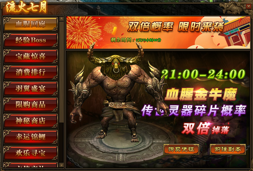《传奇世界》网页版 流火七月 精彩活动 活动一、血腥回廊 活动时间:7月16日-7月18日活动范围:全服 活动内容:1.活动期间,玩家参与“多人副本-血腥回廊”,获得“传世灵器碎片”的概率翻倍; ...