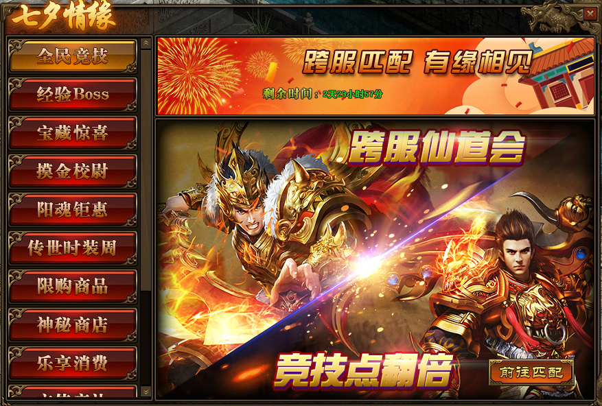 《传奇世界》8月23日 七夕情缘 精彩活动 活动一、全民竞技 活动时间:8月23日-8月25日活动范围:全服 活动内容:1.活动期间,玩家参与跨服仙道会3V3或5V5匹配,获得“竞技点”翻倍; ...