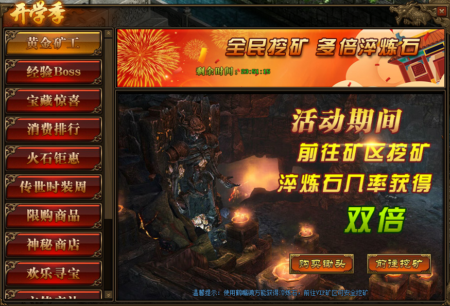 《传奇世界》网页版 开学季 精彩活动 活动一、黄金矿工 活动时间:9月5日(仅此一天)活动范围:全服 活动内容:1.活动期间,玩家使用“鹤嘴锄”进行挖矿,获得“淬炼石”的概率翻倍;2.注意:必须使用“鹤嘴锄”才 ...