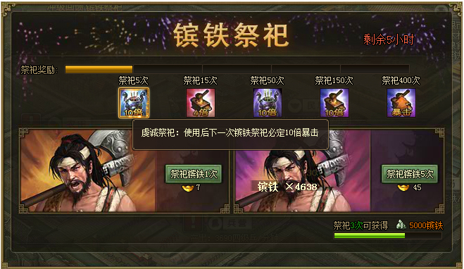 【兵器速升】镔铁祭祀,暴击连送!活动范围:3月31日(含)之前所有已开在线服活动时间:4月7日0点至4月8日24点活动内容:活动期间,达到以下镔铁祭祀要求,即可获赠额外镔铁奖励,并领取相应的暴击Buff!1. & ...