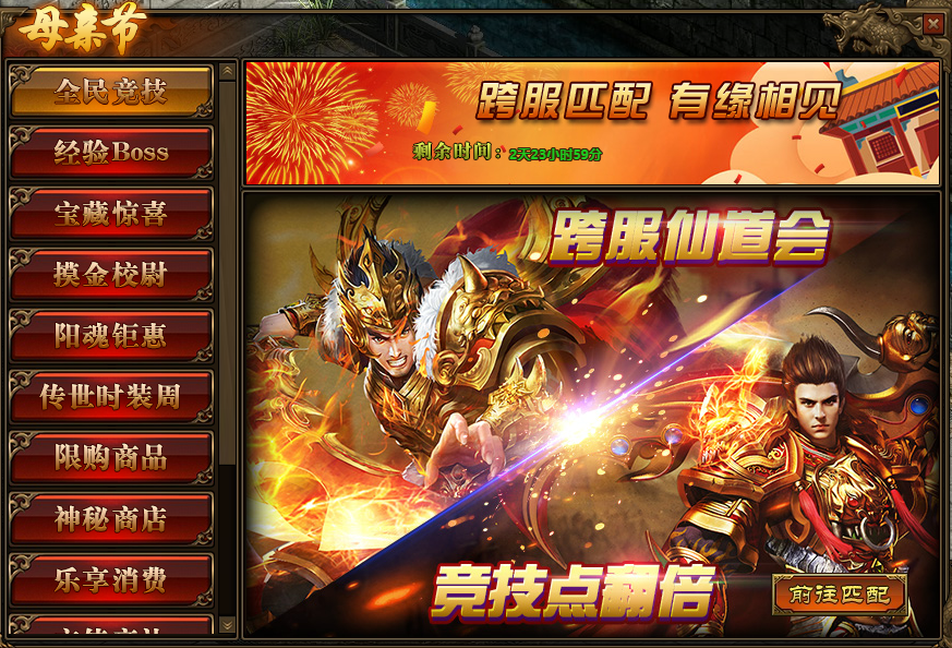 《传奇世界》网页版 母亲节 精彩活动 活动一、全民竞技 活动时间:5月7日-5月9日活动范围:全服 活动内容:1.活动期间,玩家参与跨服仙道会3V3或5V5匹配,获得“竞技点”翻倍; ...