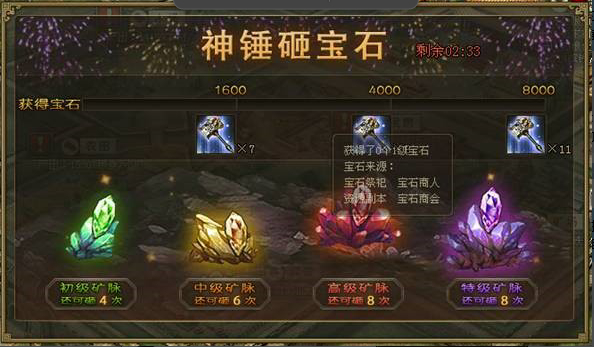 【只限1天】神锤砸宝石,实力翻倍升! 活动范围:5月14日(含)之前所有已开在线服 参与要求:已开启宝石功能 活动时间:5月21日0点至24点 活动内容:活动期间,活动将记录通过宝石工坊、祭祀、资源副本、宝石商人 ...