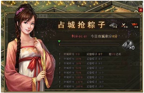 【端午乐逍遥】六一攻城送粽子,六二吃粽子大赛! 活动一:端午也热血!攻城送粽好礼多!活动范围:5月24日(含)之前所有已开在线服 活动时间:6月1日0点至24点活动内容:活动期间,每天根据占城积分获得粽子,积 ...