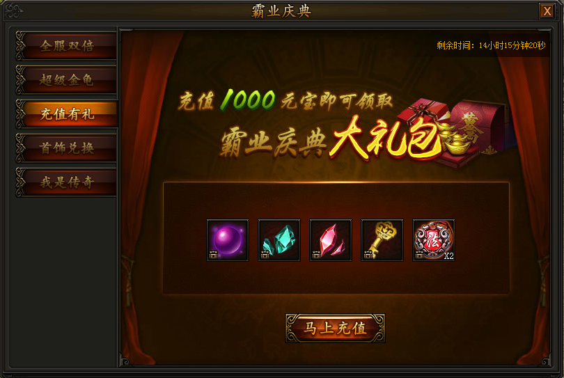 活动期间,只要充值达到1000元宝,即可领取超值霸业庆典大礼包!