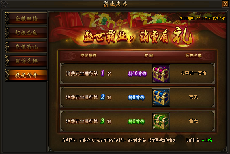 活动期间,消费满20万元宝即可参与消费排行,活动结束时,消费排行前三名的玩家可选择任意一件对应等级的极品转生首饰,活动结束后,奖励通过邮件发送。