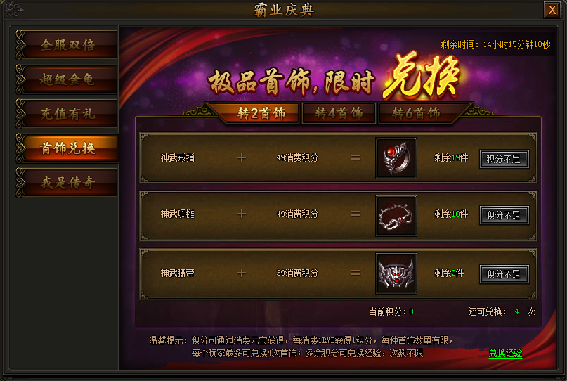 活动期间,每消费1RMB即可获得1积分,使用积分和低级首饰可兑换极品转生首饰,每人限兑4次。极品首饰数量有限,先兑先得!