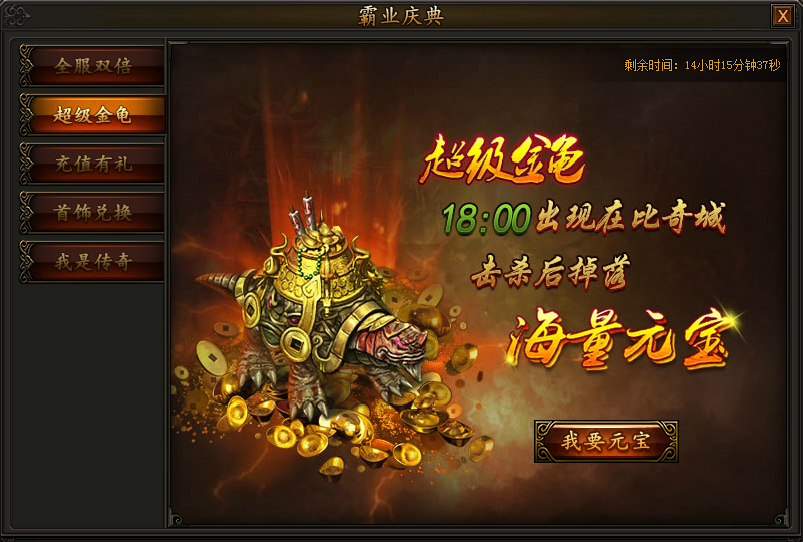 活动期间,下午18:00比奇城会刷新两只超级金龟,击杀后掉落海量不绑定元宝,所有玩家均可拾取,手快有手慢无,抓紧机会不要错过!
