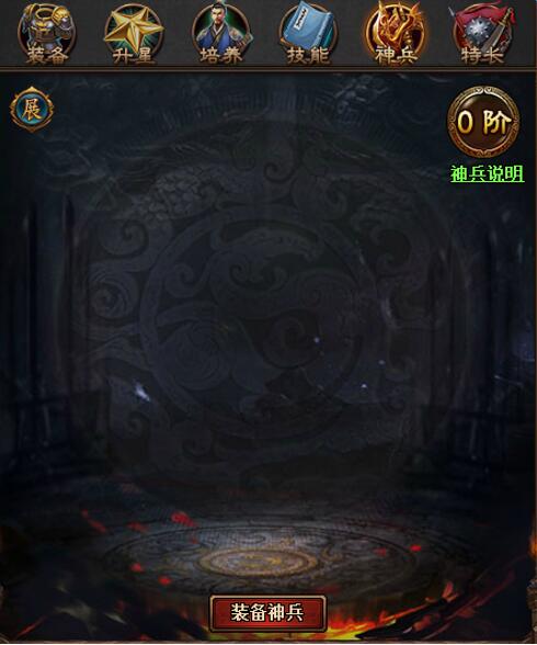 ①   神兵获得:70级开放神兵系统,神将和名将拥有自己的专属神兵,每种神兵只能获得1件。神兵由100片对应的专属神兵碎片合成得到,玩家集齐碎片后,可在神兵界面点击“神兵出世”获得0阶神兵:
