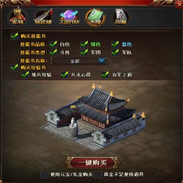 玩家可对当前有技能书、经验书出售的城池进行一键购买,可选择需要的技能书、经验书类型以及是否消耗元宝礼金和道具。当选择“使用元宝/礼金购买”时将优先使用礼金。