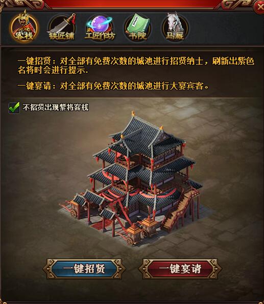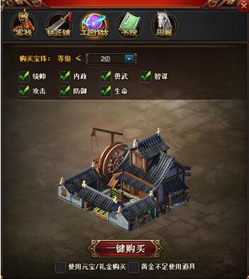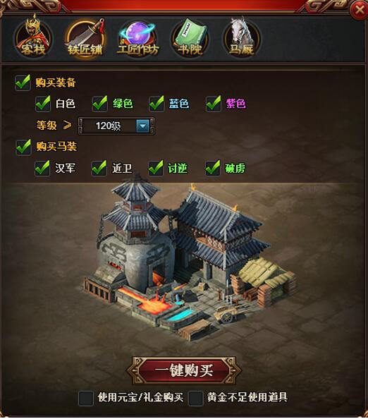 l  一键购买:可对所有城池进行一键购买操作,由客栈、铁匠铺、工匠作坊、书院、马厩5个功能组成。