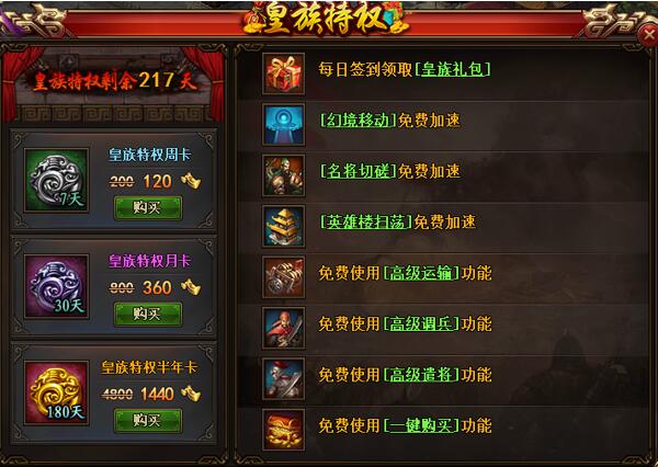 玩家可使用元宝购买皇族特权,皇族特权将帮助您更便捷的操作: