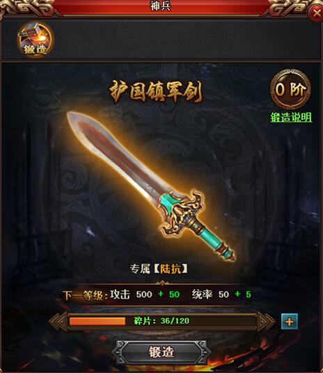 神兵可以通过锻造进行升阶,升阶消耗对应的神兵碎片:
