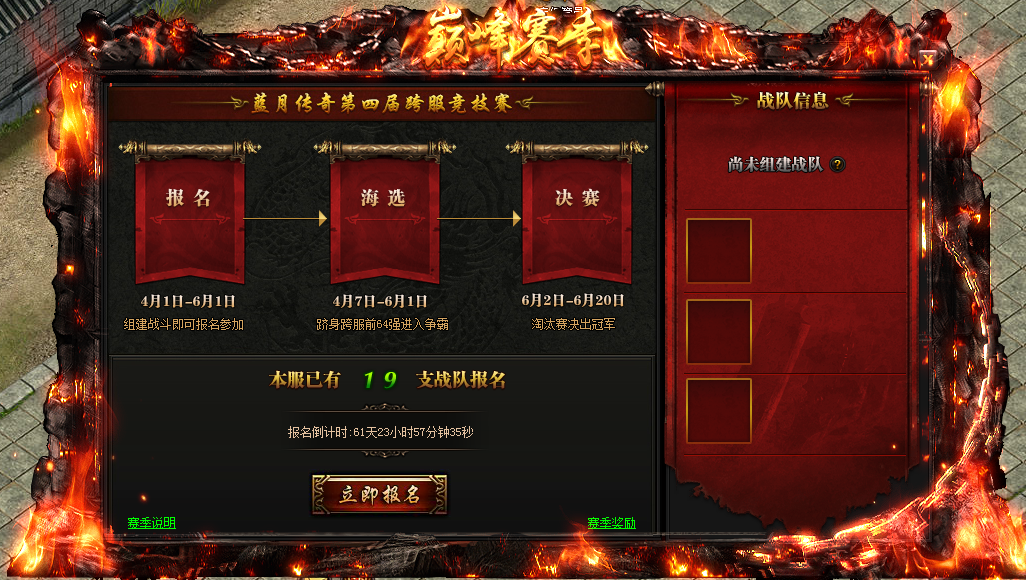 《蓝月传奇》3月24日全服更新维护公告 亲爱的玩家: 您好,为保证服务器稳定运营,优化游戏体验,我们将在3月24日对以下区服进行停服维护更新,具体维护时间将视情况提前或延后,更新安排如下: 维护时间:3月24日9:00-11:30(按这个时间) 维护范围:全平台全服(当日新服不参与) 【调整内容】 新增 1. 跨服战新增“圣域远征” 开服≥15天的区服,将于每周二或周五20:00-20:30开启“圣域远征”活动 “圣域远征”需要报名后方可参战 报名等级:转生等级≥5转 转生等级达到5转的玩家可点击“圣域远征”按钮进入活动界面 点击活动界面中的“报名参战”按钮,成功报名后,即可在活动时间内,于活动界面任意选择一个圣域进入,开启远征之旅。 报名时间截止至活动当天19:00 “圣域远征”共有7个圣域战场,分别为:幽冥圣域、烈焰圣域、光芒圣域、修罗圣域、雷霆圣域、荣耀圣域、神龙圣域 玩家可选择任一圣域进入,以所在区服为单位,在战场内与敌方阵营争夺该圣域战旗的归属 以最后一击击杀战旗的玩家所在的区服,获得该圣域战旗的归属 活动时间内,战旗可被反复争夺,活动结束时,战旗的归属方即获得该圣域的归属权 玩家可点击活动追踪面板中的“成员详情”按钮,打开“成员详情”面板,实时查看当前圣域中己方成员和敌方成员的相关信息 玩家可点击活动追踪面板中的“领地传送”按钮,打开“领地传送”面板,查看各个圣域的占领情况,圣域名称下方有“占”字标识的即代表该圣域当前已被己方占领 活动时间内,玩家可任意前往其它圣域,继续抢夺其它圣域的归属权 成功占领圣域的区服,该区服全体参战成员可在活动结束后,于“圣域远征”活动界面领取丰厚的圣域占领奖励。 圣域远征,满载激情与荣耀的探险之旅,待你携友开启! 2. “跨服竞技巅峰赛”第四届开启 荣誉与情义的巅峰“跨服竞技巅峰赛”第四届火热开启,亲爱的玩家们赶快携手小伙伴一同报名参加吧~ “跨服竞技巅峰赛”分为:组队报名→海选→决赛三个阶段 --报名阶段 报名时间:2018年4月1日--2018年6月1日 报名规则: 1.玩家达到7转,需组建或加入一支三人战队,由队长进行报名。 2.海选赛结束之前都可以创建或加入一支战队。 3.在报名阶段,队长可以任意修改战队名称。在海选开始后,只能改名一次。在决赛开始后,无法改名。 报名入口:转生等级达到7转的玩家可以在“竞技巅峰赛”报名开始后,点击“巅峰赛季”按钮进入报名界面。 --海选阶段 海选时间:2018年4月7日--2018年6月1日 海选规则:1.在海选期间,已报名的战队可在每周三、六晚21:00-22:00,于“跨服战场”的“竞技场”内参与海选赛,每天5场,共计16天80场。 2.系统根据战队积分,自动匹配对手战队。 3.海选结束后,跨服战队总积分排名前64强,获得进入决赛的资格。 海选赛入口:已报名的战队可在海选赛活动开启时间内,通过点击“跨服战场”按钮进入 “巅峰赛季“界面,参与海选赛。 参与海选赛的战队可点击“巅峰赛季”按钮,进入巅峰赛季界面,时刻了解战队当前积分及排名情况。 --决赛阶段 决赛时间:2018年6月2日--2018年6月20日 决赛规则:1.当海选赛所有场次结束后,根据跨服战队积分排行,前64强战队获得决赛资格。 2.决赛开始后,系统根据战队积分,自动匹配合适的对手战队。 3.64强战队依次决出16强、4强。4强再决出冠军、亚军、季军。 4.决赛开启时,未及时参赛的战队视为放弃。 玩家可点击“巅峰赛季”按钮,进入巅峰赛季界面,时刻了解进入决赛的战队的排名情况。 --“跨服竞技巅峰赛”参与有奖 奖励规则:1.海选赛至决赛期间,战队参与比赛单场获胜不发放奖励,每场获胜的奖励将进行累计,于赛季结束后统一发放。 2.海选赛结束后,未进入决赛的战队根据战队积分排行可获得一定奖励。 3.决赛结束后,根据战队最终排名发放奖励。 4.冠军战队和亚军、季军战队可获得丰厚奖励以及专属酷炫称号。