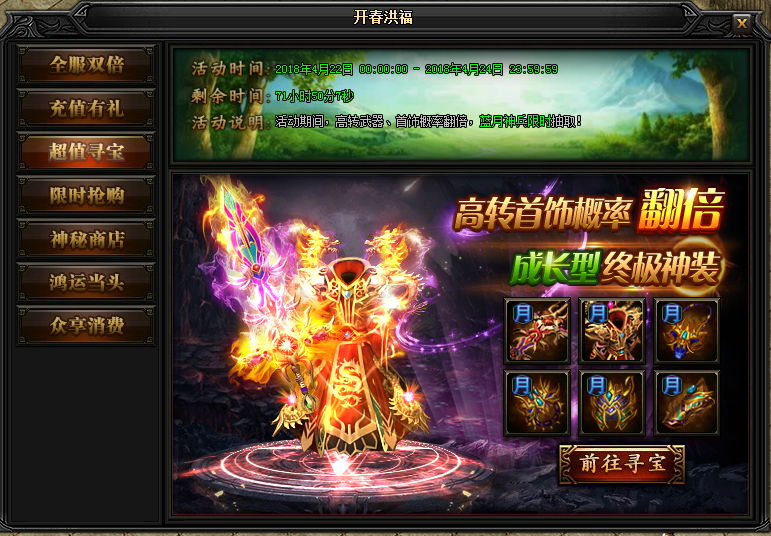 活动说明:活动期间,高转武器、首饰概率翻倍,蓝月神兵限时抽取!