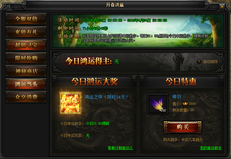 活动说明 : 玩家购买特惠礼包可获得幸运数字。每日21:00点抽取今日幸运数字,拥有该数字的玩家即可获得今日鸿运大奖。