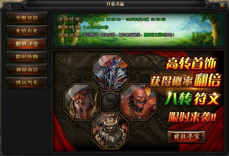 活动说明:活动期间,高转武器、首饰概率翻倍,高转符文限时抽取!