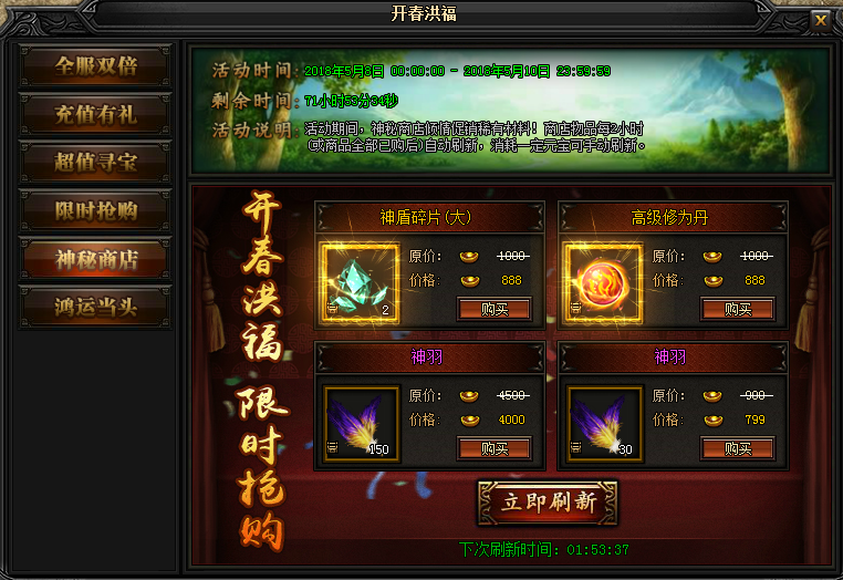 活动说明:活动期间,神秘商店倾情促销稀有材料!商店物品每2小时(或商品全部已购后)自动刷新,消耗一定元宝可手动刷新。