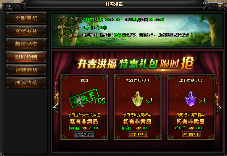 活动说明:活动期间,极品材料特价限时出售,超低价格, 助你迅速提升实力!