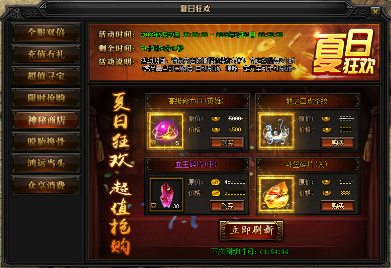 活动说明:活动期间,神秘商店倾情促销稀有材料!商店物品每2小时(或商品全部已购后)自动刷新,消耗一定元宝可手动刷新。