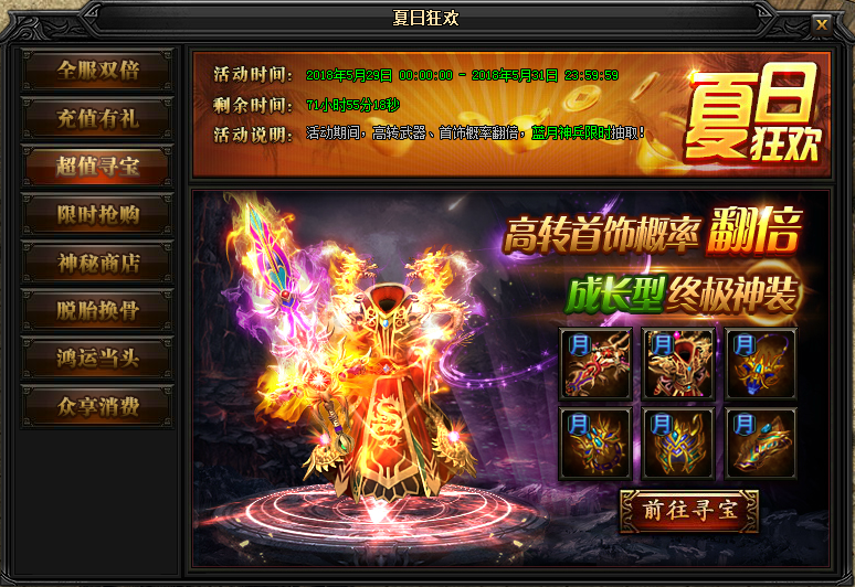 活动说明:活动期间,高转武器、首饰概率翻倍,蓝月神兵限时抽取!