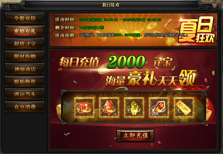 活动说明:活动期间,每日充值满2000、20000元宝!还能领取超值豪华大礼。