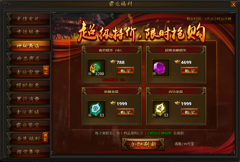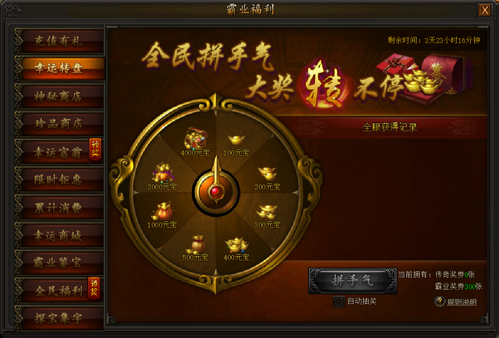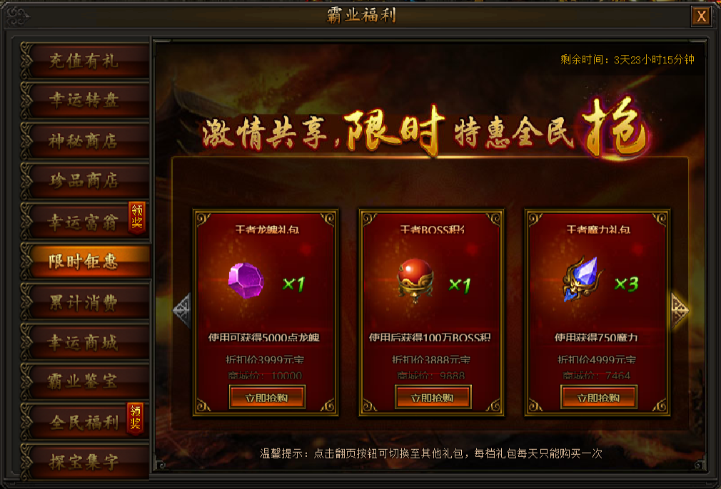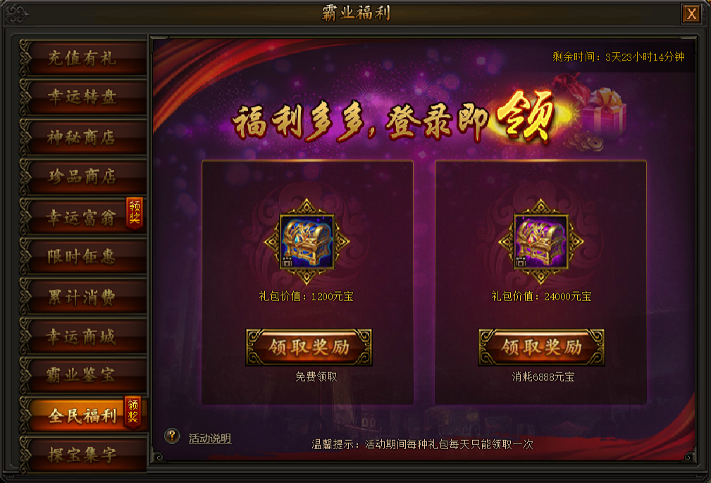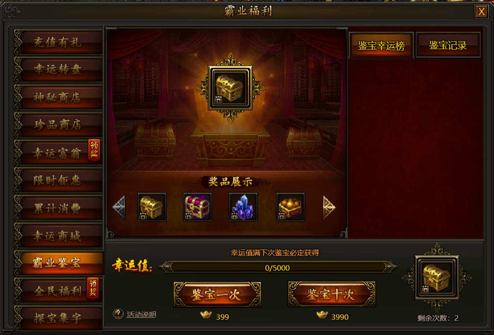 8. 幸运商城 活动时间:2018年6月22日0点——6月25日23:59 活动期间,每隔一段时间,商城限时上架一批新道具(全服限量),每轮每个角色有最大购买次数,折扣多多,不容错过。 9. 霸业鉴宝 活动时间:2018年6月22日0点——6月25日23:59 活动期间,花费一定数量元宝即可进行霸业鉴宝,每次鉴宝均可获得祝福值,祝福值满后下一次鉴宝必出极品大奖,数量有限,不容错过。 10. 全民福利 活动时间:2018年6月22日0点——6月25日23:59 活动期间,80级及以上玩家登录即可领取免费礼包,花费一定数量元宝还可购买超值礼包,每个角色每种礼包每天只能领取一次! 11. 探宝集字 活动时间:2018年6月22日0点——6月25日23:59 活动期间,探宝可能获得“传奇霸业盛典豪礼”字帖,集齐字帖可兑换海量不绑定元宝奖励!